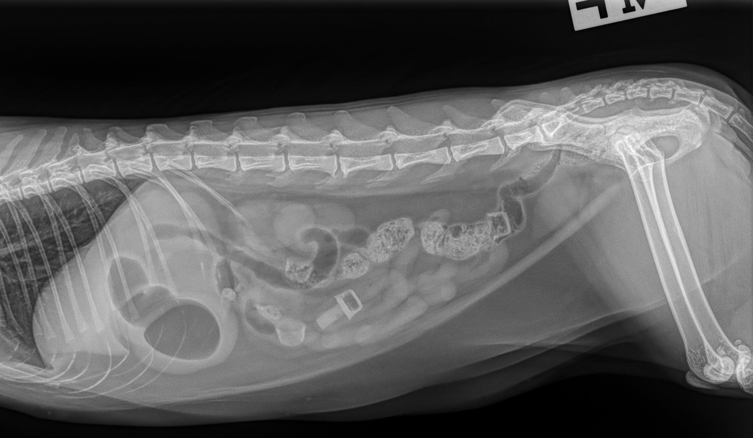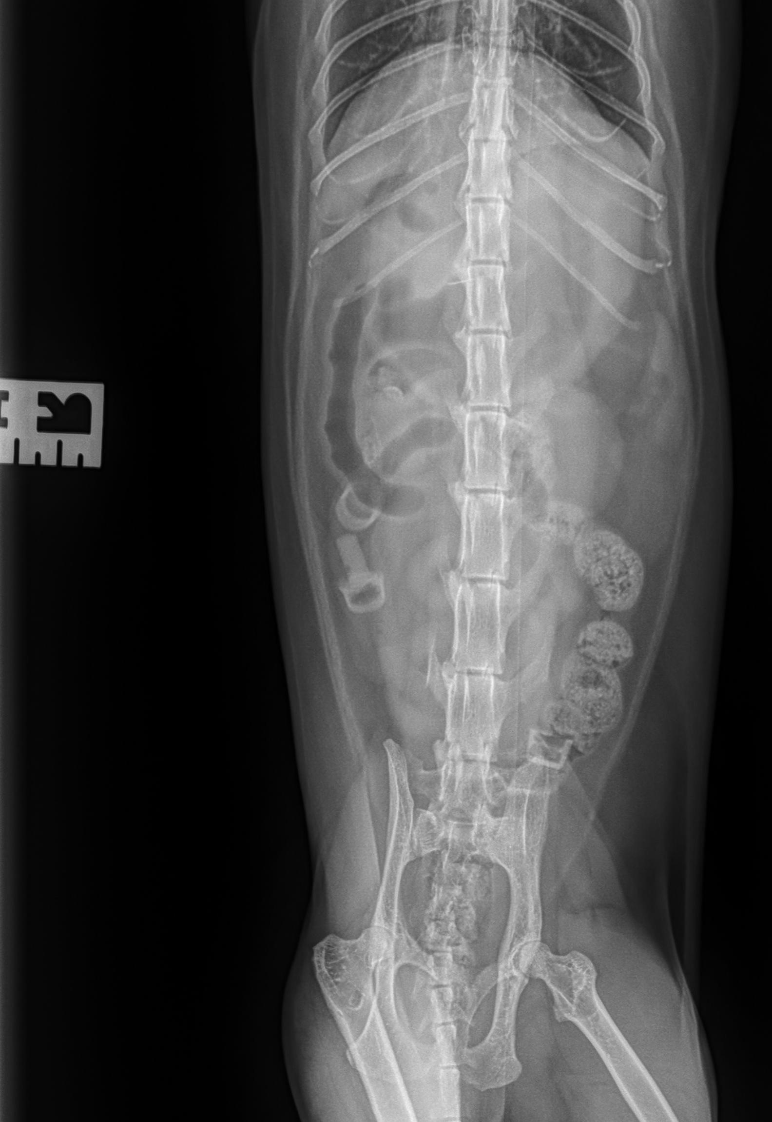- Opletten voor een mechanische obstructie, vanwege dilatatie van de maag en de dunne darm (minstens van partiële aard). De aanwezigheid van twee kogels in het colon kan echter wijzen op mogelijke spontane passage. Herhaalde abdominale radiografie en of abdominale echografie kan overwogen worden binnen 8 tot 12 uur, of eerder indien de patiënt klinisch verslechtert of niet verbetert, voor verdere evaluatie indien klinisch geïndiceerd. Als alternatief kan een chirurgische exploratie overwogen worden indien klinisch geïndiceerd.