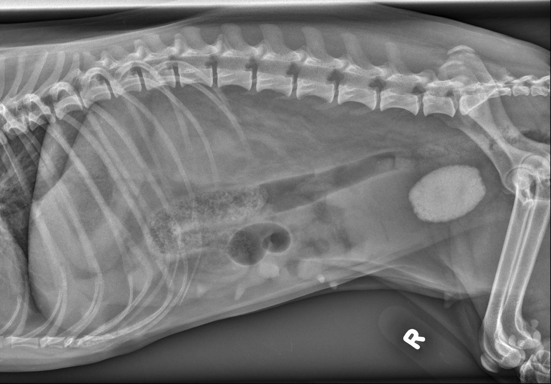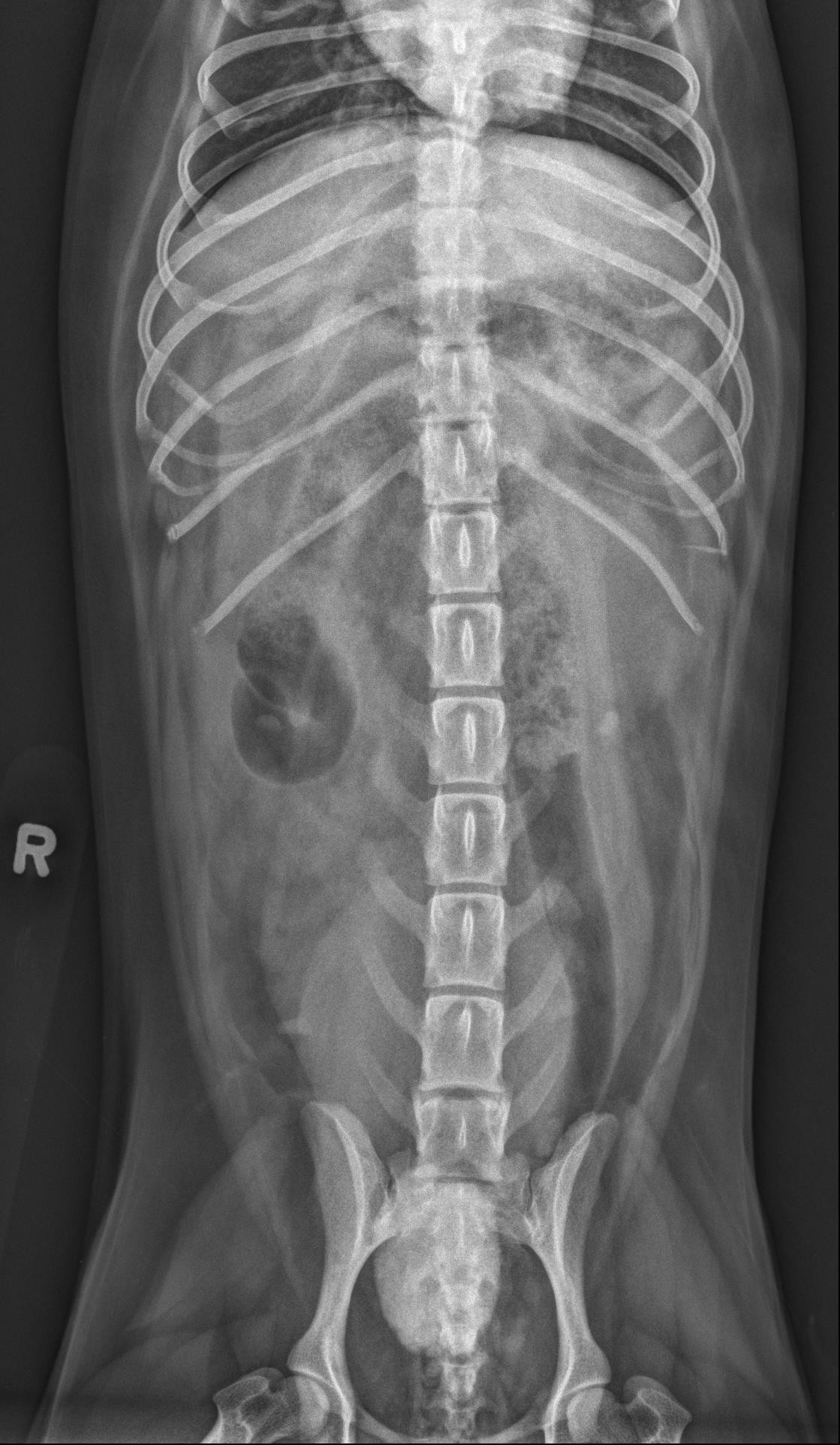 Een 5-jarige vrouwelijke hond, kruising. Om 1 uur ‘s nachts merkte de eigenaar op dat de patiënt urine druppelde en jankte van de pijn.