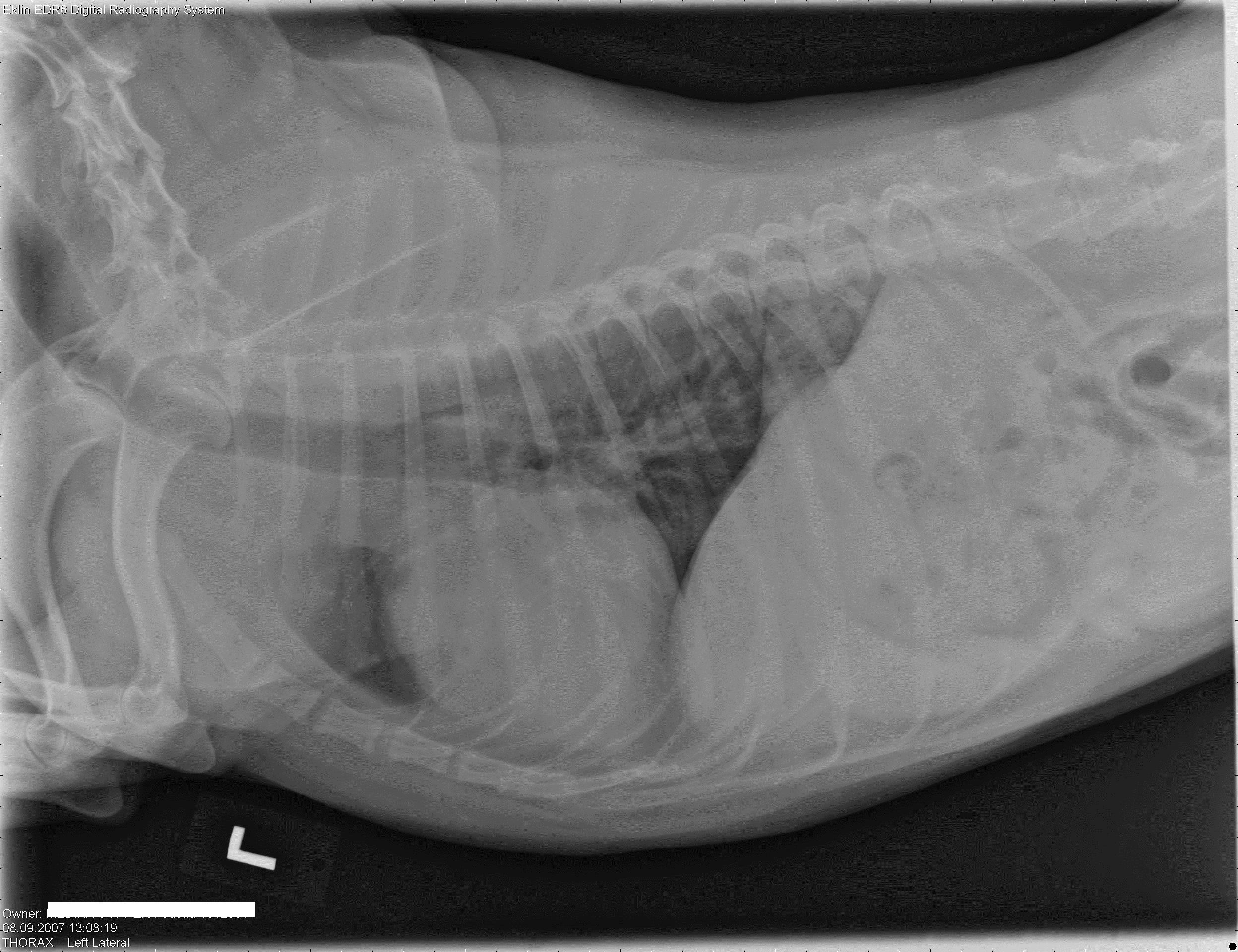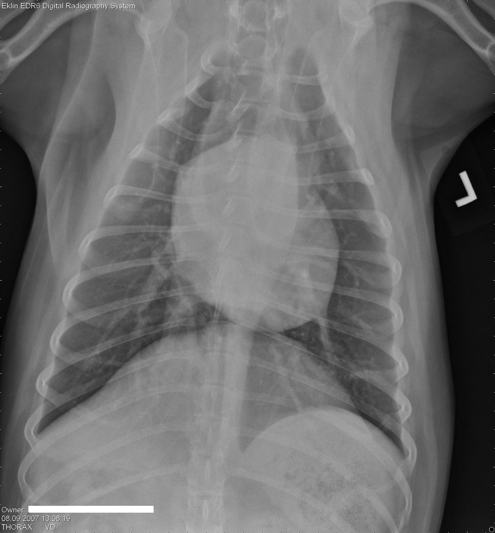 Thorax: Over het algemeen worden het pulmonale parenchym en de cardiovasculaire structuren als binnen de normale grenzen beschouwd. Er is geen radiografisch bewijs dat duidt op pulmonale metastasen.