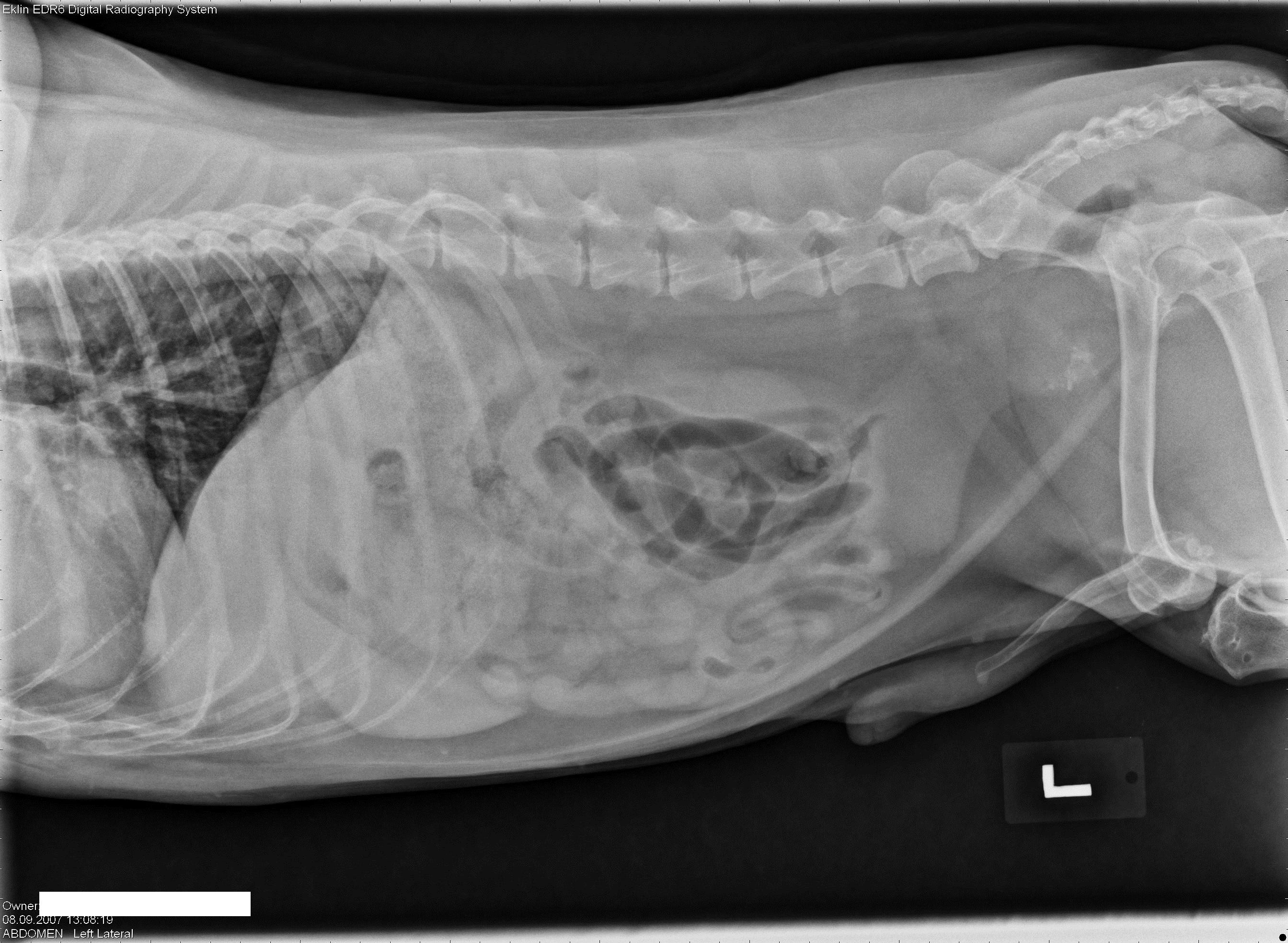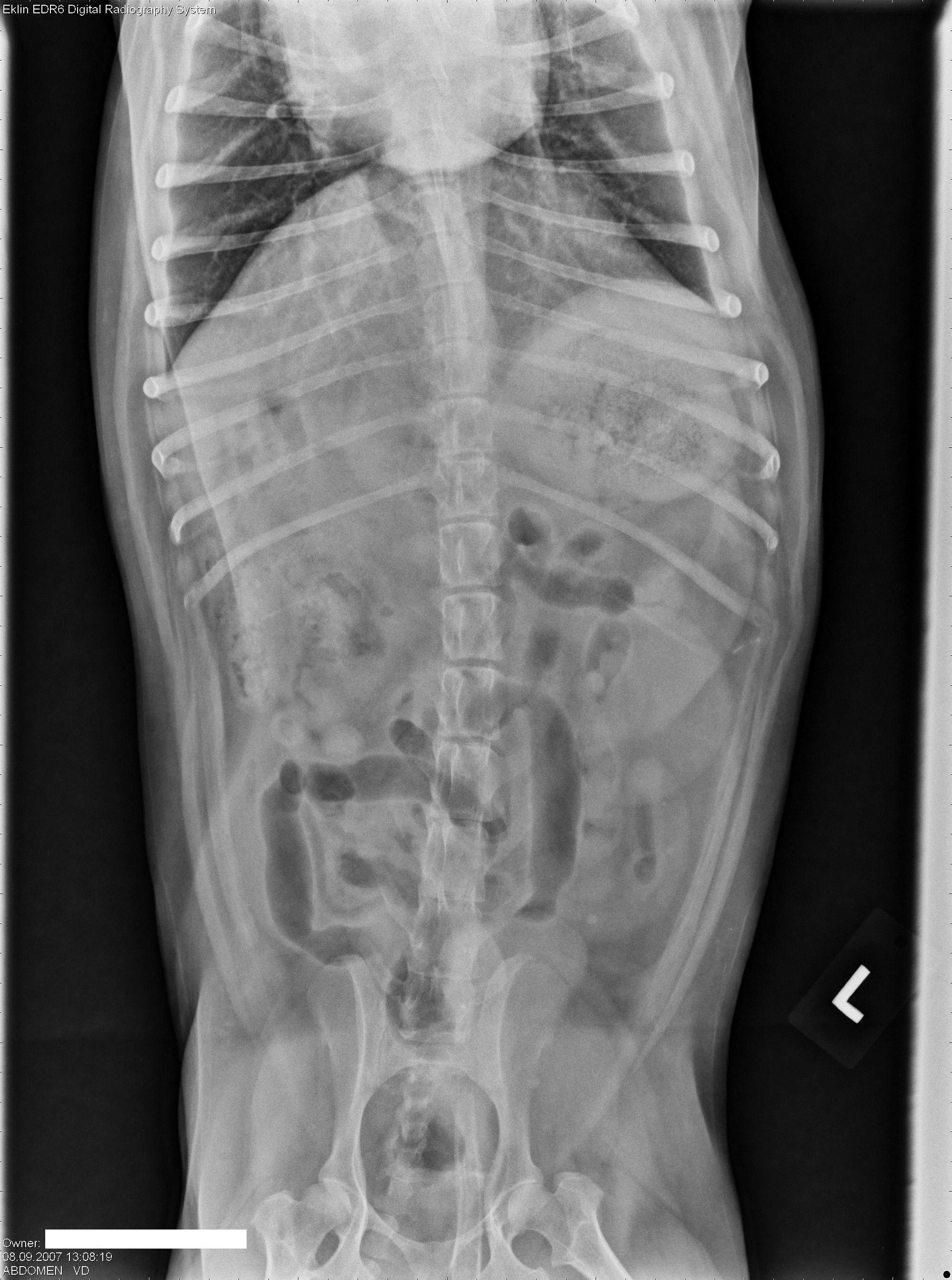 Abdomen: Er is over het algemeen goede serosale detailering binnen de buikholte. De prostaat is merkbaar vergroot, wat resulteert in dorsale afwijking en compressie van de dikke darm ter hoogte van L7 – S1. Verder wordt in het ventrale craniale gedeelte van de prostaat een matige hoeveelheid dystrofische troebele mineralisatie waargenomen. Er is geen bewijs van sublumbale lymfadenopathie of lumbale wervellysis.